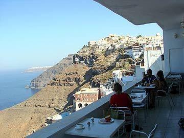 General description This is a fantastic property, ideal for travellers wishing to stay within the main town. Hotel facilities also include a Television lounge, a roof top cafe, a sauna, a fitness center and jacuzzi.Guests are invited to use the swimming pool of the sister hotel next door(0109/AC) Location Perfectly located in the centre of Fira town on the main street that runs from the church around the edge of the cliffs , this property is actually situated on the cliff side boasting fantastic views of the sea, nearby islands and caldera (volcano). Being centrally located this hotel benefits from having many restaurants and shops nearby. Rooms The rooms are medium sized and tastefully decorated. Each room is equipped with a mini fridge, television, telephone, air conditioning, heating, hair dryer, safe box, music and a balcony with stunning views over the Aegean Sea, the volcano and the sunset. Exterior This is a typical whitewashed cycladic building, situated on the cliff side. Restaurant The breakfast room is medium in size, simply decorated and has a stunning view over Caldera. Lobby The lobby is small to medium in size but functional, and decorated in a minimalist style.